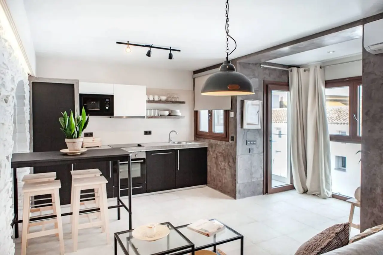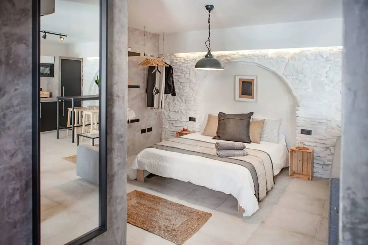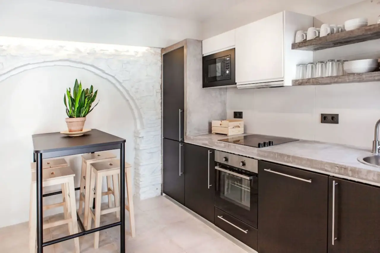 El edificio es parte de un antiguo convento totalmente rehabilitado y convertido a 6 pequeños estudios con encanto. Manteniendo todo la magia de los antiguos muros de piedra y de la construcción original, cuenta con todas las comodidades de una casa recién reformada (ascensor, aire acondicionado, bomba de calor, WIFI, televisión led de 40″, lavavajillas, horno, nevera, microhondas, extractor, menaje de cocina….) Así como servicio de toallas y sábanas limpias a vuestra llegada para que os sintáis como en casa. Aunque es un estudio, tiene capacidad para 4 personas, es cómodo y amplio, cuenta con una cama de matrimonio y sofa-cama doble de facil apertura en el salón. Es ideal para una pareja con niños o para un par de amig@s. Aunque la casa está dividida en dormitorio / zona de baño y salón cocina, se trata de una estudio de concepto abierto, es decir que todos los espacios están comunicados entre sí, siendo la única puerta la del wc, puedes ver el plano en el apartado de fotos.